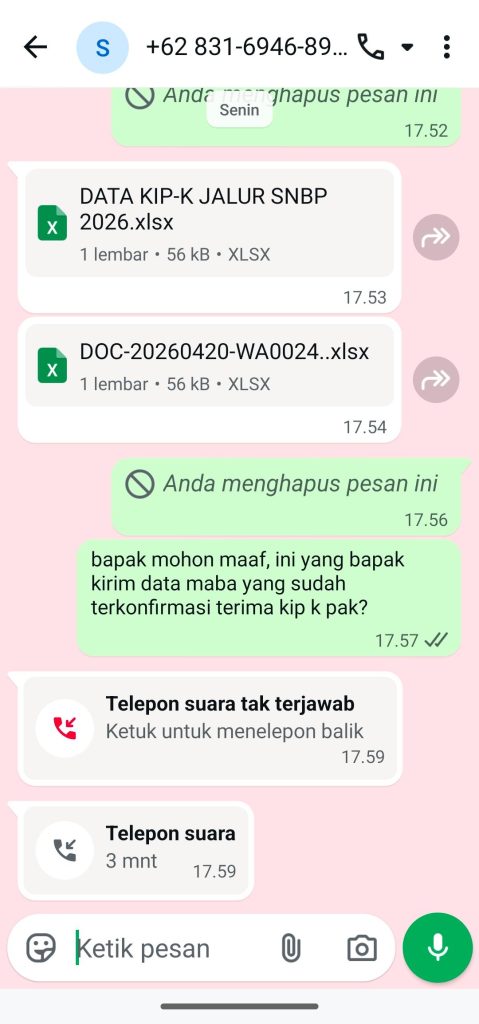 Pelaku juga mengirimkan data pendaftar Kartu Indonesia Pintar Kuliah (KIPK) dalam bentuk spreadsheet untuk meyakinkan korban. “Saya percaya karena pelaku mengirim data KIP-K, kurang lebih ada data 600 orang di situ. Jadi, saya pikir dia dosen,” tuturnya.